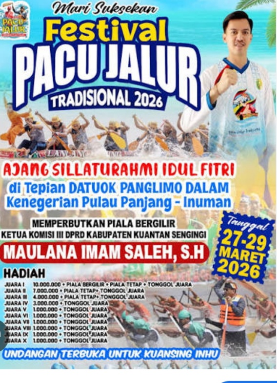 Kilatriau.id – Menjelang hari pelaksanaan Festival Pacu Jalur ajang Silaturahmi memperebutkan piala bergilir ketua komisi lll DPRD Kabupaten Kuantan Singingi Maulana Imam Saleh ,S.H Hari Raya Idul Fitri 1447 Hijriah di Tepian Datuak Panglimo Dalam, Desa Pulau Panjang Hilir Kecamatan, Kabupaten Kuantan Singingi(Kuansing).