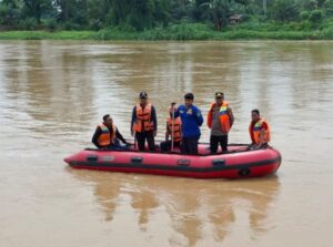 Pencarian masih berlanjut dilakukan baik dari darat maupun menggunakan perahu karet di sepanjang aliran sungai.
