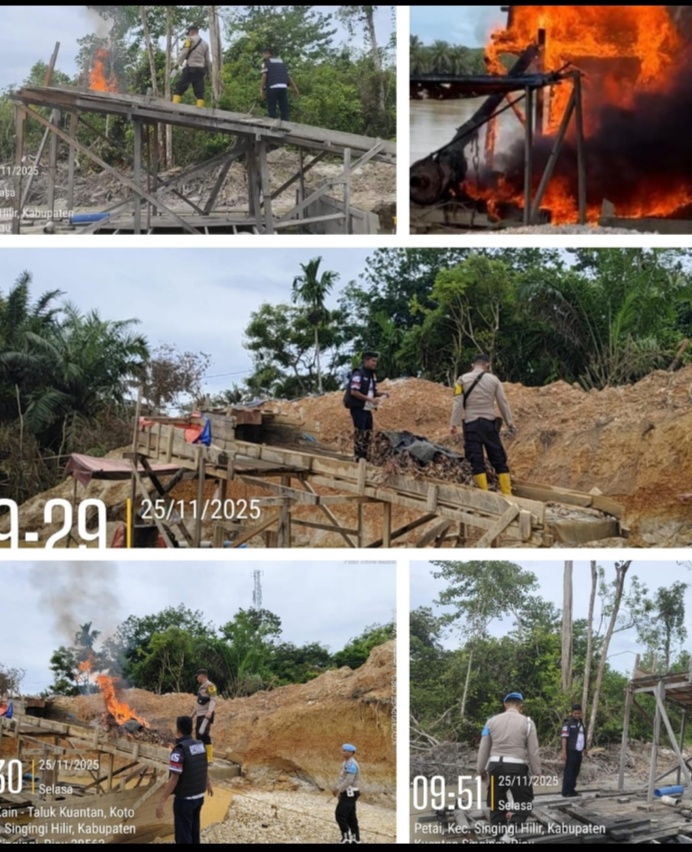 Kilatriau.id – Kuantan Singingi,- Polsek Singingi Hilir kembali melakukan penindakan tegas terhadap aktivitas Penambangan Emas Tanpa Izin (PETI) di wilayah hukumnya, terutama di wilayah Desa Koto Baru dan Desa Petai, Kecamatan Singingi Hilir, Kabupaten Kuantan Singingi, Selasa (25-11-2025)