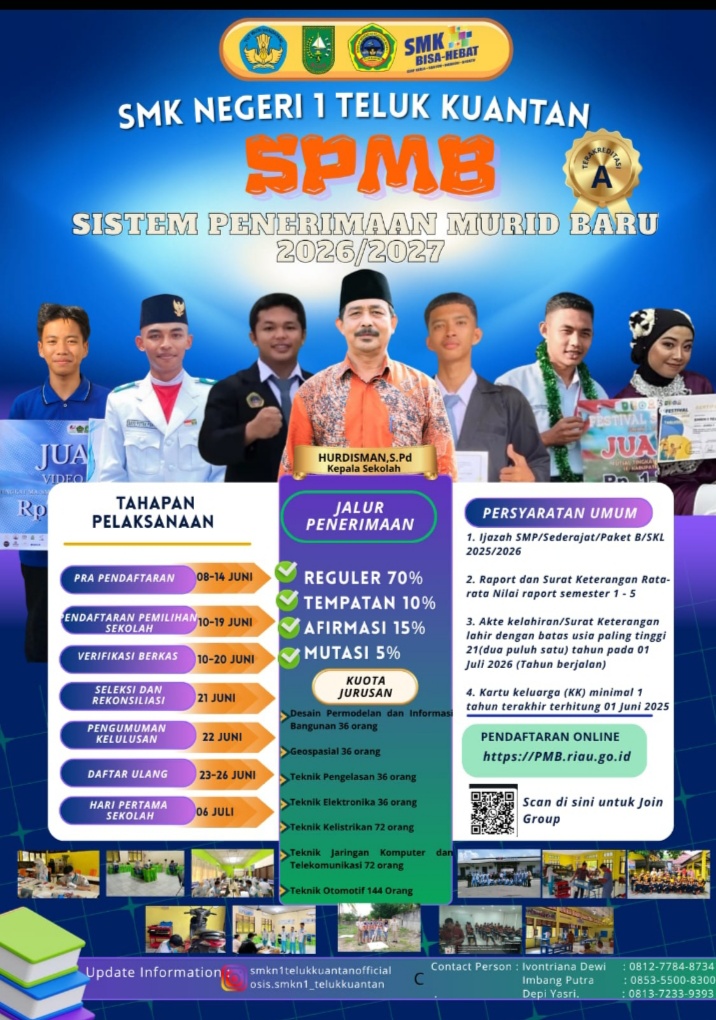 SMK Negeri 1 Teluk Kuantan di bawah kepemimpinan Kepala Sekolah Hurdisman S.Pd. Sasaran SPMB adalah seluruh calon murid baru lulusan SMP/Sederajat/Paket B yang memenuhi persyaratan usia maksimal 21 tahun per 1 Juli 2026.